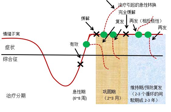 由于雙相障礙幾乎終生以循環(huán)方式反復(fù)發(fā)作,其治療目標(biāo)除緩解急性期癥狀外,還應(yīng)堅(jiān)持全病程治療原則以阻斷反復(fù)發(fā)作。醫(yī)生應(yīng)在治療開始前告知患者和家屬全病程治療的重要性及實(shí)施辦法,爭(zhēng)取良好的依從性。全病程治療可分為3個(gè)治療期: